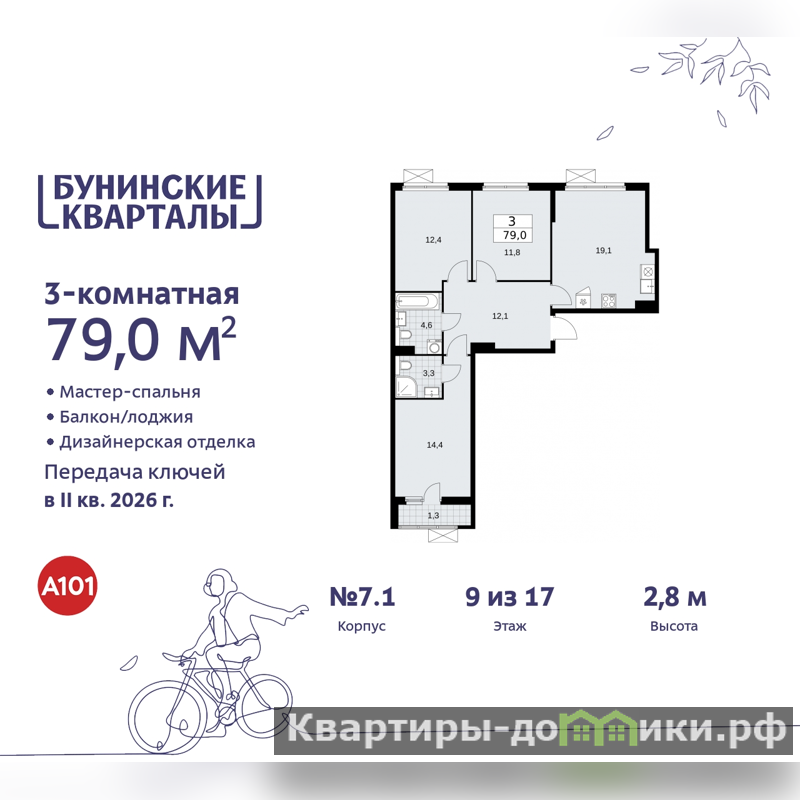 Продается 3-комн. квартира с отделкой в ЖК "Бунинские кварталы" на 9 этаже. Общая площадь: 79 кв.м., жилая: 38.6 кв.м., площадь просторной кухни-столовой: 19.1 кв.м. Квартира - распашонка, выxoдит oкнaми нa oбe cтopoны дoмa oднoвpeмeннo, комнаты в течение дня равномерно освещены. В квартире один балкон, два совмещенных санузла. Высота потолков 2.8 м.