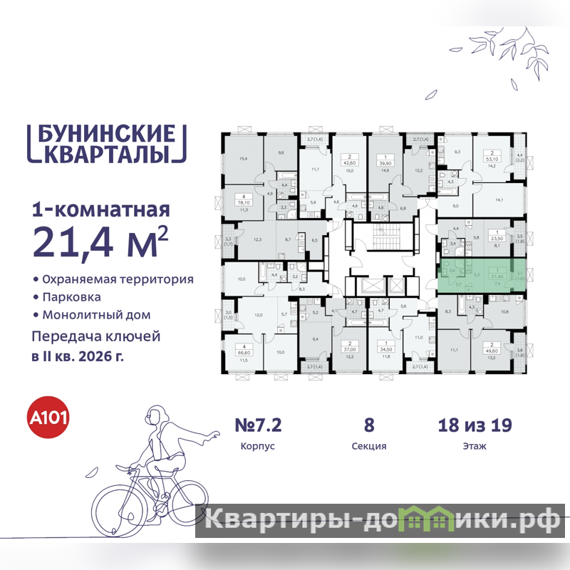 Продается 1-комн. квартира-студия с отделкой в ЖК "Бунинские кварталы" на 18 этаже. Общая площадь: 21.4 кв.м., площадь гостиной 12.7 кв.м., из которых 5.3 кв.м. выделено под кухонную зону. Все окна выходят на одну сторону. В квартире один балкон, один совмещенный санузел. Высота потолков 2.8 м.