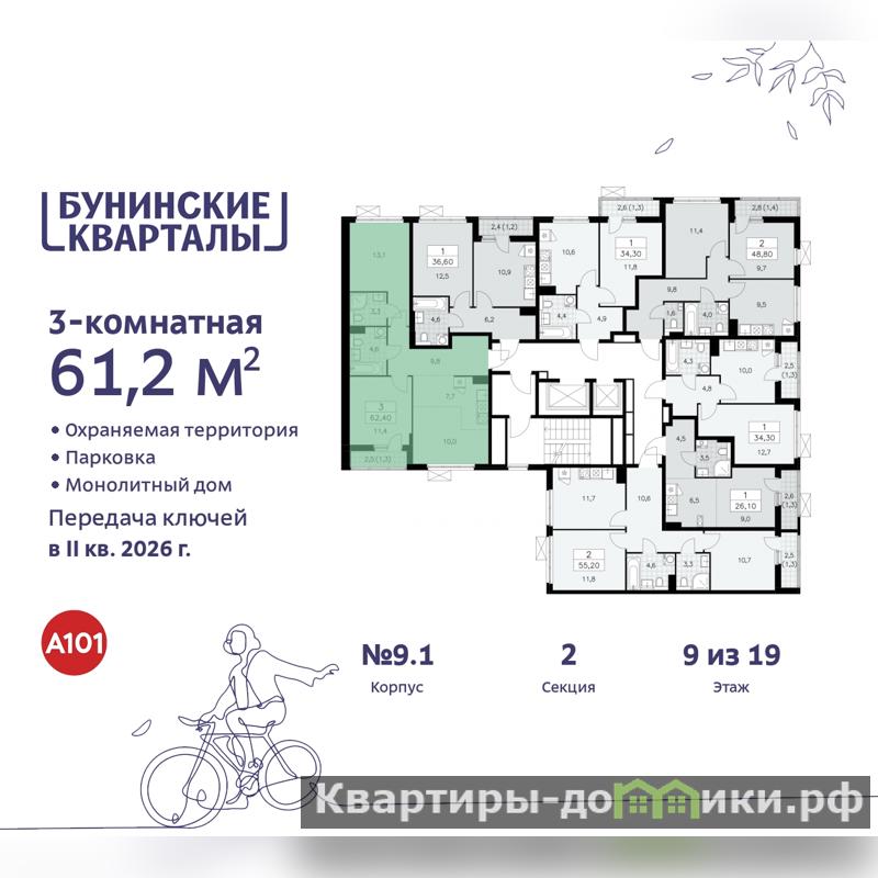 Трехкомнатная квартира с европланировкой в ЖК "Бунинские кварталы" на 9 этаже. Квартира без отделки, новый владелец может сделать ремонт по индивидуальному проекту. Общая площадь: 61.2 кв.м., жилая: 34.5 кв.м., суммарная площадь гостиной-столовой с кухонной зоной: 17.7 кв.м. Европейская планировка, кухня и гостиная объединены в одно просторное помещение. Квартира - распашонка, без проходных комнат, окна выходят на paзные стороны дома. В квартире одна лоджия, два совмещенных санузла. Высота потолков 2.8 м.