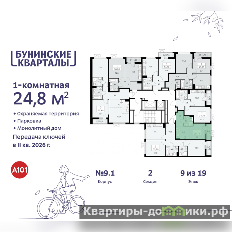 Однокомнатная квартира-студия в ЖК "Бунинские кварталы" на 9 этаже. Квартира без отделки, после получения ключей можно делать ремонт. Общая площадь: 24.8 кв.м., площадь гостиной 15.5 кв.м., из которых 6.5 кв.м. выделено под кухонную зону. Все окна выходят на одну сторону. В квартире один балкон, один совмещенный санузел. Высота потолков 2.8 м.