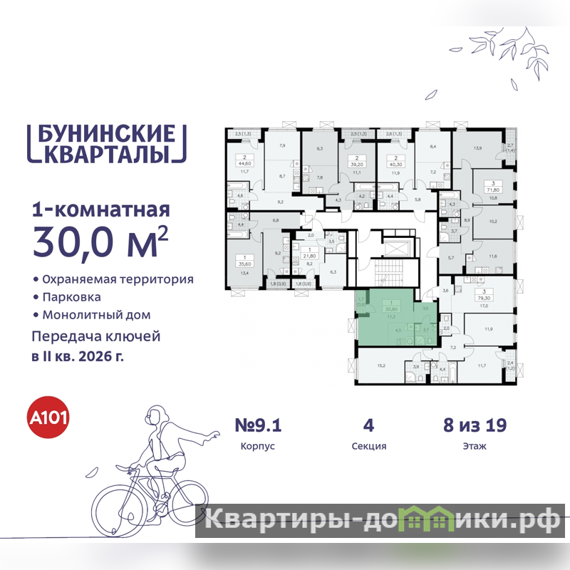 Дом монолитный, многоподъездный, переменной этажности, от 9 до 19 этажей. Квартира находится в 4-й секции высотой 9 этажей в корпусе 9.1. На этаже 8 квартир. В подъезде 1 грузовой лифт. Начало строительства - 4 квартал 2023 года. Окончание строительства - 2 квартал 2026 года. Оформление сделки по договору долевого участия.