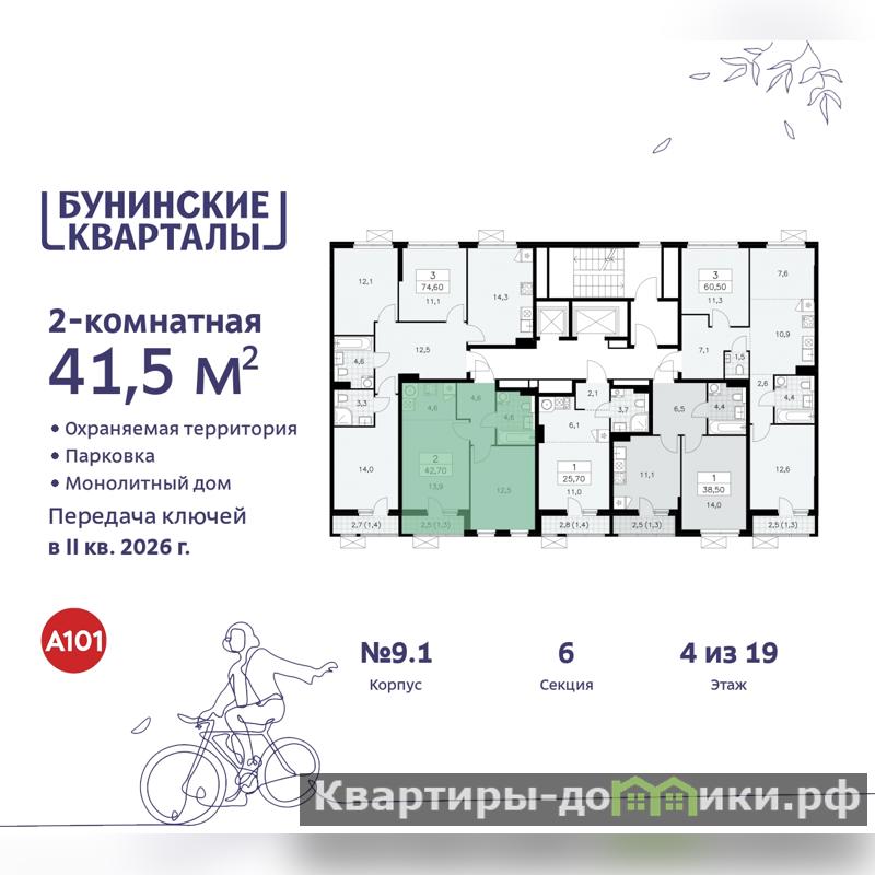 Дом монолитный, многоподъездный, переменной этажности, от 9 до 19 этажей. Квартира находится в 6-й секции высотой 19 этажей в корпусе 9.1. На этаже 5 квартир. В подъезде 1 пассажирский и 1 грузовой лифт. Начало строительства - 4 квартал 2023 года. Окончание строительства - 2 квартал 2026 года. Оформление сделки по договору долевого участия.