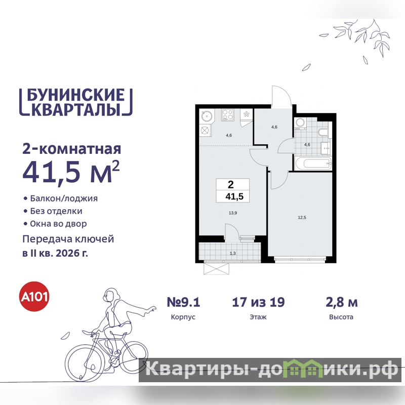 Просторная 2-комн. квартира с европланировкой в ЖК "Бунинские кварталы" на 17 этаже. Квартира без отделки, после выдачи ключей можно делать ремонт. Общая площадь: 41.5 кв.м., жилая: 26.4 кв.м., общая площадь гостиной-столовой с кухонной зоной: 18.5 кв.м. Европейская планировка, кухня-гостиная - идеальный вариант для тех, кто любит часто принимать гостей. Комнаты изолированные, все окна выходят на одну сторону. В квартире одна лоджия, один совмещенный санузел. Высота потолков 2.8 м.