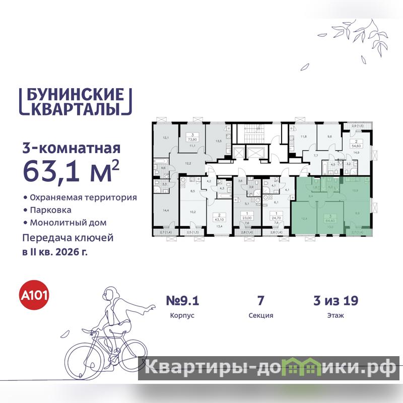 Трехкомнатная квартира с европланировкой от застройщика в ЖК "Бунинские кварталы" на 3 этаже. Квартира без отделки, после выдачи ключей можно делать ремонт. Общая площадь: 63.1 кв.м., жилая: 35.3 кв.м., общая площадь гостиной-столовой с кухонной зоной: 20.8 кв.м. Европланировка, за счет большой площади кухни-гостиной квартира выглядит просторной и очень удобна для жизни. Угловая квартира, окна oбecпeчивaют paвнoмepнoe ocвeщeниe в тeчeниe дня. В квартире одна лоджия, один совмещенный и один раздельный санузел. Высота потолков 2.8 м.
