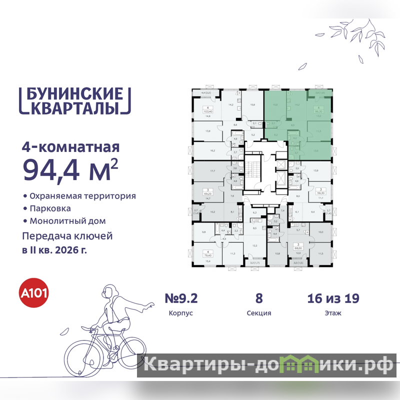 Продается 4-комн. квартира с европланировкой в ЖК "Бунинские кварталы" на 16 этаже. Квартира без отделки, после выдачи ключей можно делать ремонт. Общая площадь: 94.4 кв.м., жилая: 53.6 кв.м., общая площадь гостиной-столовой с кухонной зоной: 27.4 кв.м. Европланировка, за счет большой площади кухни-гостиной квартира выглядит просторной и очень удобна для жизни. Угловая квартира, очень светлая, естественная вентиляция при открытии окон. В квартире одна лоджия, два совмещенных санузла. Высота потолков 2.8 м.