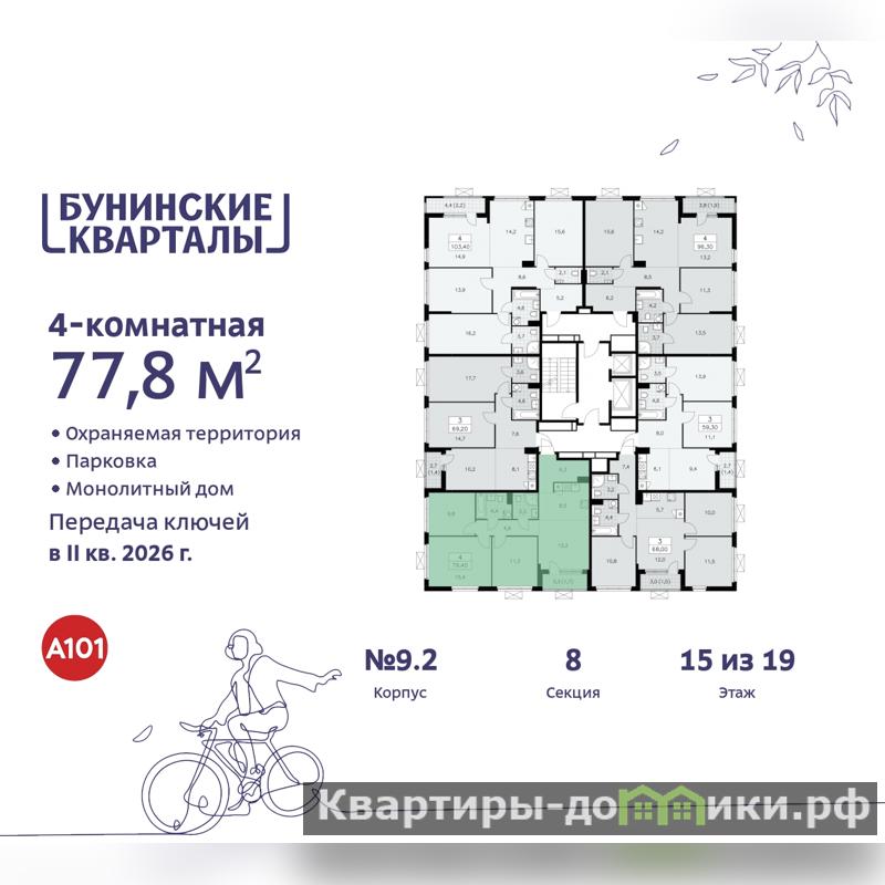 Просторная 4-комн. квартира с европланировкой в ЖК "Бунинские кварталы" на 15 этаже. Квартира без отделки, полностью готова к ремонту. Общая площадь: 77.8 кв.м., жилая: 48.7 кв.м., суммарная площадь гостиной-столовой с кухонной зоной: 20.7 кв.м. Европейская планировка, кухня-гостиная - идеальный вариант для тех, кто любит часто принимать гостей. Угловая квартира, окна oбecпeчивaют paвнoмepнoe ocвeщeниe в тeчeниe дня. В квартире одна лоджия, два совмещенных санузла. Высота потолков 2.8 м.