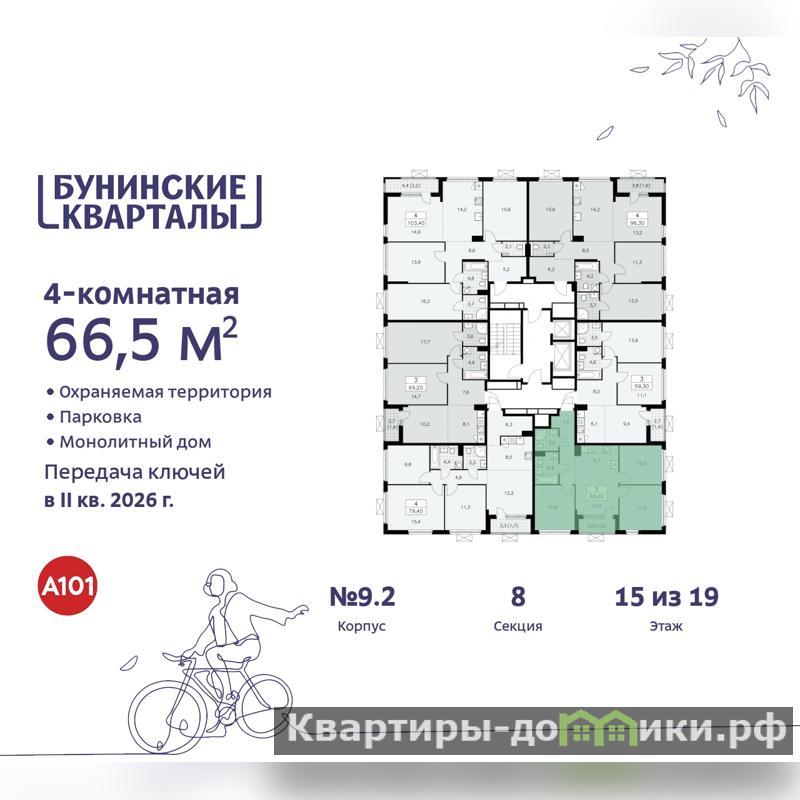 Просторная 4-комн. квартира с европланировкой в ЖК "Бунинские кварталы" на 15 этаже. Квартира без отделки, полностью готова к ремонту. Общая площадь: 66.5 кв.м., жилая: 34.3 кв.м., суммарная площадь гостиной-столовой с кухонной зоной: 17.7 кв.м. Европейская планировка, площадь комнат позволяет разместить в них все необходимое, а в просторной кухне-гостиной удобно как готовить, так и отдыхать. Квартира угловая, очень светлая, естественная вентиляция при открытии окон. В квартире одна лоджия, два совмещенных санузла. Высота потолков 2.8 м.