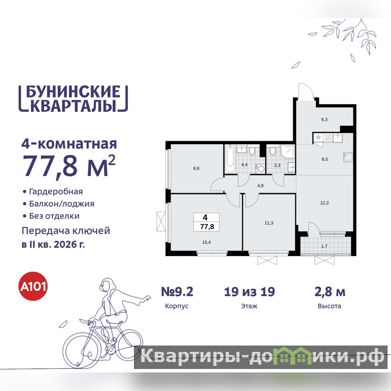 Продается 4-комн. квартира с европланировкой в ЖК "Бунинские кварталы" на 19 этаже. Квартира без отделки, новый владелец может сделать ремонт по своему дизайн-проекту. Общая площадь: 77.8 кв.м., жилая: 48.7 кв.м., общая площадь гостиной-столовой с кухонной зоной: 20.7 кв.м. Европейская планировка, зона гостиной комнаты объединена с кухней. Квартира угловая, идеально подойдет любителям тишины и панорамных видов. В квартире одна лоджия, два совмещенных санузла. Высота потолков 2.8 м.