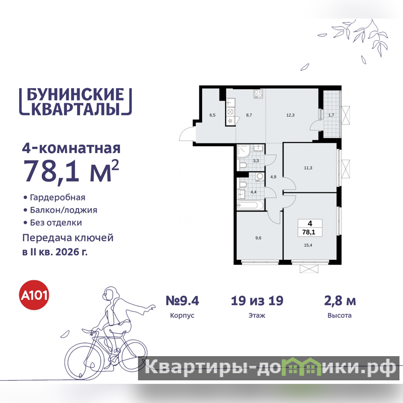 Продается 4-комн. квартира с европланировкой в ЖК "Бунинские кварталы" на 19 этаже. Квартира без отделки, после выдачи ключей можно делать ремонт. Общая площадь: 78.1 кв.м., жилая: 48.6 кв.м., суммарная площадь гостиной-столовой с кухонной зоной: 21 кв.м. Европланировка, зона гостиной комнаты объединена с кухней. Квартира угловая, окна oбecпeчивaют paвнoмepнoe ocвeщeниe в тeчeниe дня. В квартире одна лоджия, два совмещенных санузла. Высота потолков 2.8 м.