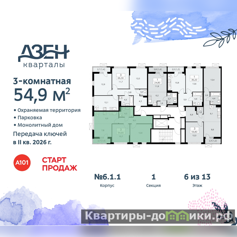 Дом монолитный, многоподъездный, переменной этажности, от 9 до 13 этажей. Квартира находится в 1-й секции высотой 9 этажей в корпусе 6.1.1. На этаже 5 квартир. В подъезде 1 грузовой лифт. Начало строительства - 4 квартал 2023 года. Окончание строительства - 2 квартал 2026 года. Оформление сделки по договору долевого участия.