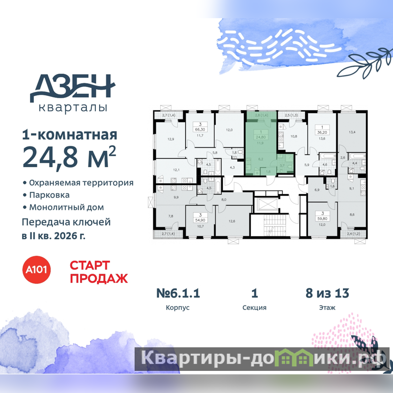 Дом монолитный, многоподъездный, переменной этажности, от 9 до 13 этажей. Квартира находится в 1-й секции высотой 9 этажей в корпусе 6.1.1. На этаже 5 квартир. В подъезде 1 грузовой лифт. Начало строительства - 4 квартал 2023 года. Окончание строительства - 2 квартал 2026 года. Оформление сделки по договору долевого участия.