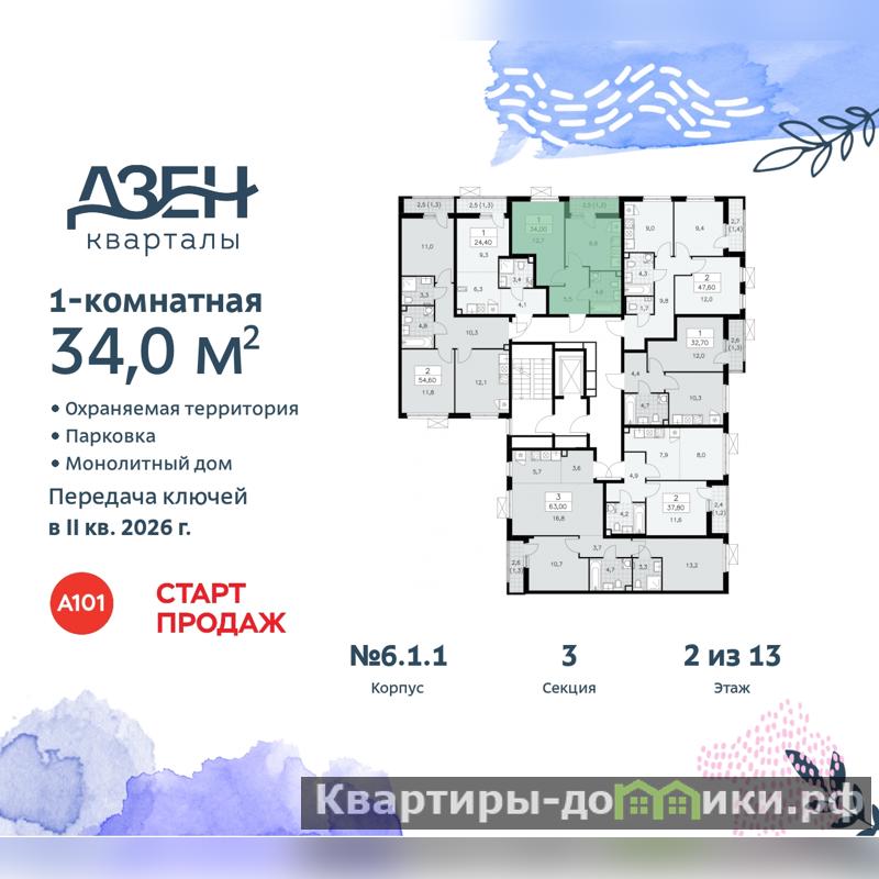 1-комн. квартира от застройщика в ЖК "Дзен-кварталы" на 2 этаже. Квартира без отделки, новый собственник может сделать ремонт по своему дизайн-проекту. Общая площадь: 34 кв.м., жилая: 12.7 кв.м., площадь просторной кухни-столовой: 9.9 кв.м. Все окна выходят на одну сторону. В квартире одна лоджия, один совмещенный санузел. Высота потолков 2.8 м.