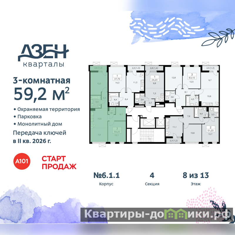 Дом монолитный, многоподъездный, переменной этажности, от 9 до 13 этажей. Квартира находится в 4-й секции высотой 11 этажей в корпусе 6.1.1. На этаже 5 квартир. В подъезде 1 пассажирский и 1 грузовой лифт. Начало строительства - 4 квартал 2023 года. Окончание строительства - 2 квартал 2026 года. Оформление сделки по договору долевого участия.