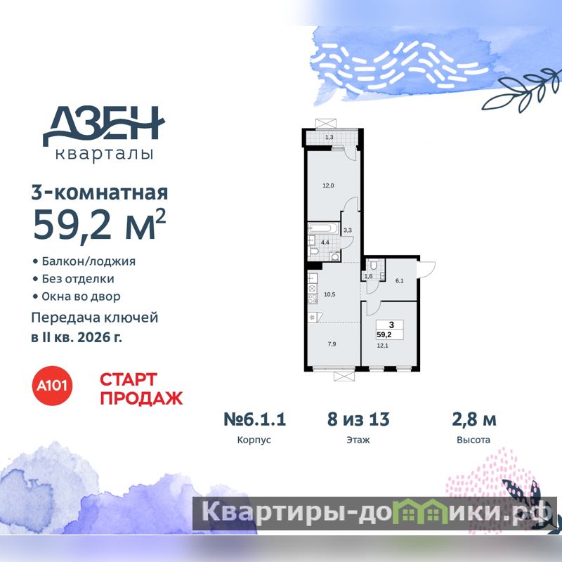 Просторная 3-комн. квартира с европланировкой в ЖК "Дзен-кварталы" на 8 этаже. Квартира без отделки, после оформления собственности можно делать ремонт. Общая площадь: 59.2 кв.м., жилая: 32 кв.м., суммарная площадь гостиной-столовой с кухонной зоной: 18.4 кв.м. Европейская планировка, за счет большой площади кухни-гостиной квартира выглядит просторной и очень удобна для жизни. Квартира - распашонка, без проходных комнат, окна выходят на paзные стороны дома. В квартире один балкон, один совмещенный и один раздельный санузел. Высота потолков 2.8 м.