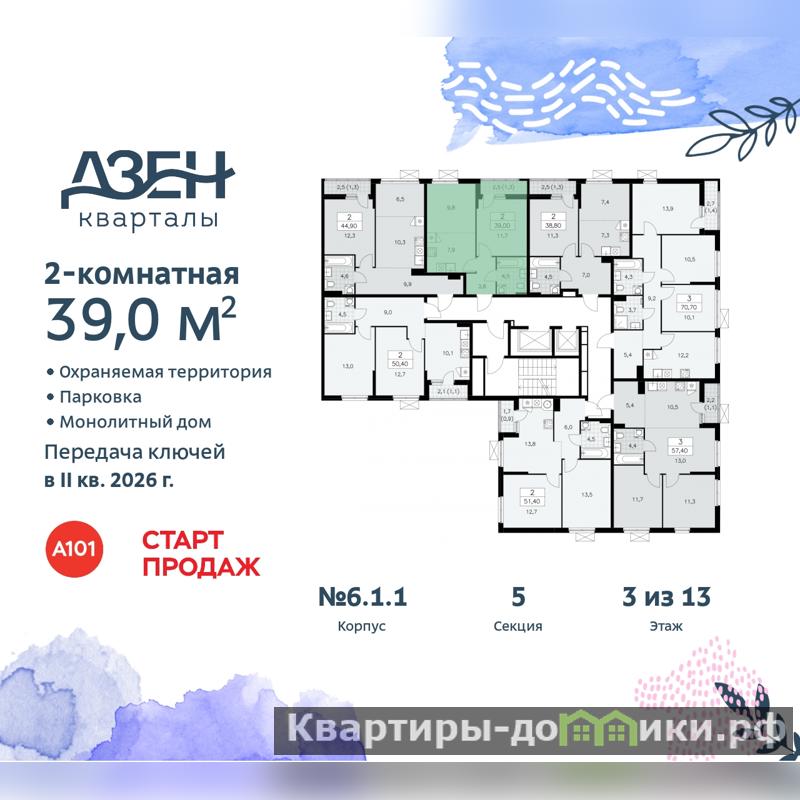Дом монолитный, многоподъездный, переменной этажности, от 9 до 13 этажей. Квартира находится в 5-й секции высотой 13 этажей в корпусе 6.1.1. На этаже 7 квартир. В подъезде 1 пассажирский и 1 грузовой лифт. Начало строительства - 4 квартал 2023 года. Окончание строительства - 2 квартал 2026 года. Оформление сделки по договору долевого участия.
