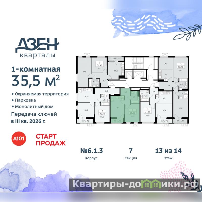1-комн. квартира с отделкой в ЖК "Дзен-кварталы" на 13 этаже. Общая площадь: 35.5 кв.м., жилая: 11.5 кв.м., площадь просторной кухни-столовой: 13.1 кв.м. Все окна выходят на одну сторону. В квартире одна лоджия, один совмещенный санузел. Высота потолков 2.8 м.