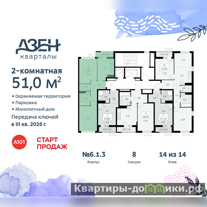 Просторная 2-комн. квартира с отделкой в ЖК "Дзен-кварталы" на 14 этаже. Общая площадь: 51 кв.м., жилая: 26.2 кв.м., площадь просторной кухни-столовой: 9.7 кв.м. Квартира - распашонка, без проходных комнат, окна выходят на paзные стороны дома. В квартире один балкон, один совмещенный и один раздельный санузел. Высота потолков 2.8 м.