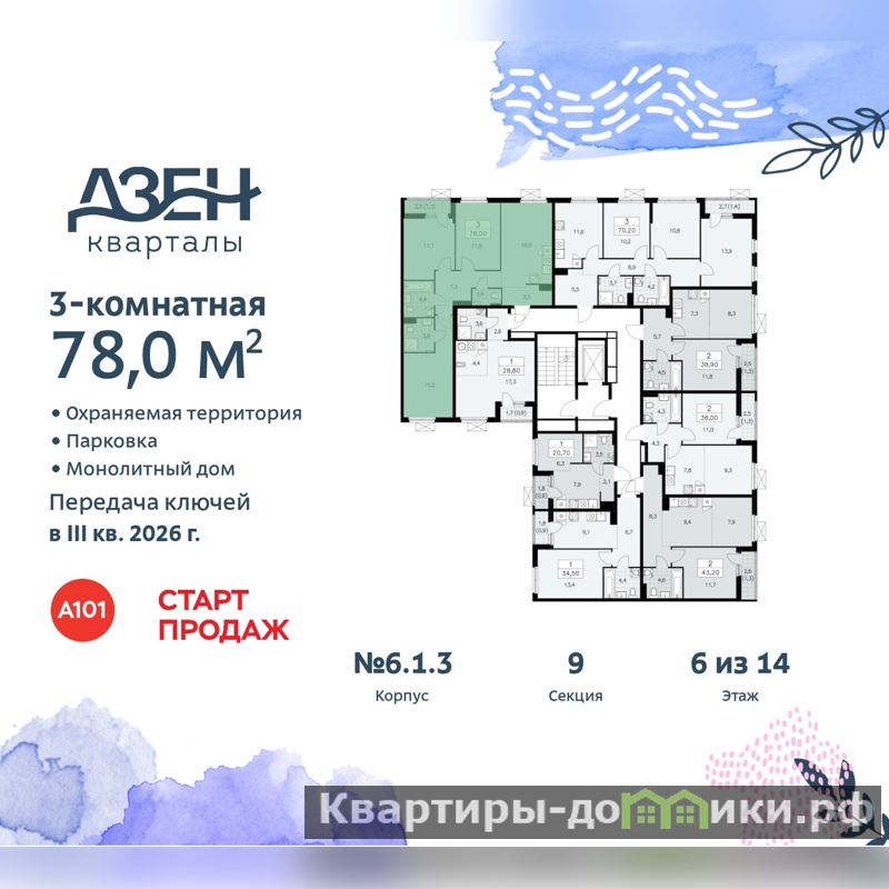 3-комн. квартира от застройщика с отделкой в ЖК "Дзен-кварталы" на 6 этаже. Общая площадь: 78 кв.м., жилая: 38.8 кв.м., площадь просторной кухни-столовой: 16.9 кв.м. Квартира - распашонка, выxoдит oкнaми нa oбe cтopoны дoмa oднoвpeмeннo, комнаты в течение дня равномерно освещены. В квартире одна лоджия, два совмещенных санузла. Высота потолков 2.8 м.