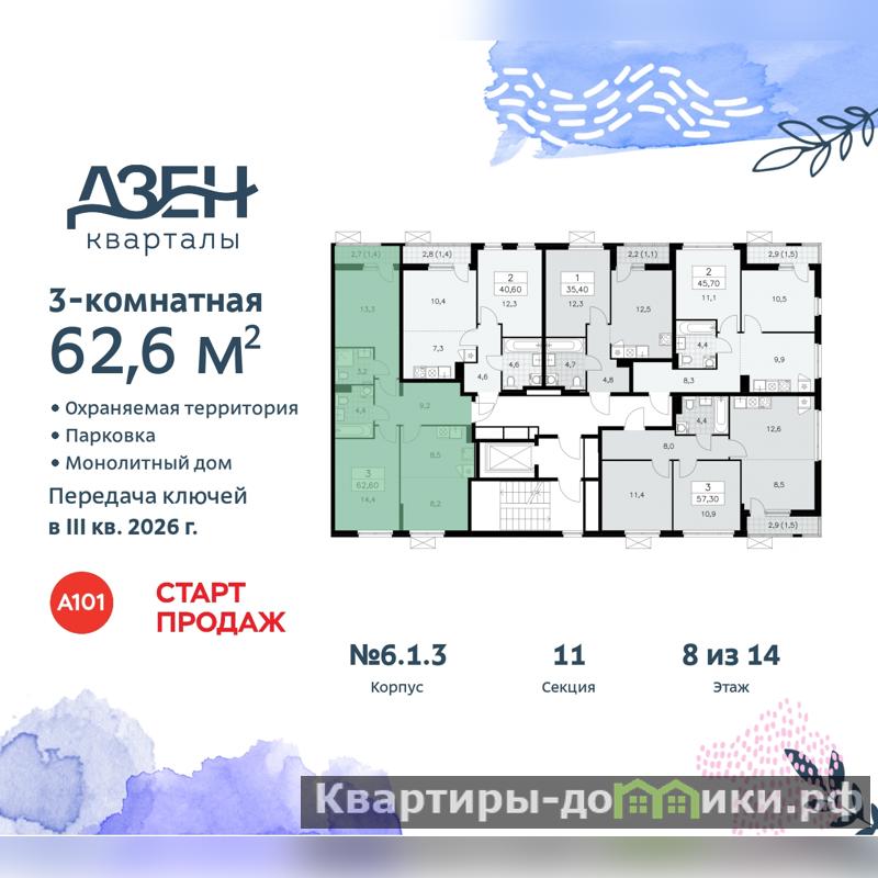 Трехкомнатная квартира с европланировкой и отделкой в ЖК "Дзен-кварталы" на 8 этаже. Общая площадь: 62.6 кв.м., жилая: 35.9 кв.м., общая площадь гостиной-столовой с кухонной зоной: 16.7 кв.м. Европланировка, кухня и гостиная объединены в одно просторное помещение. Квартира - распашонка, без проходных комнат, окна выходят на paзные стороны дома. В квартире один балкон, два совмещенных санузла. Высота потолков 2.8 м.