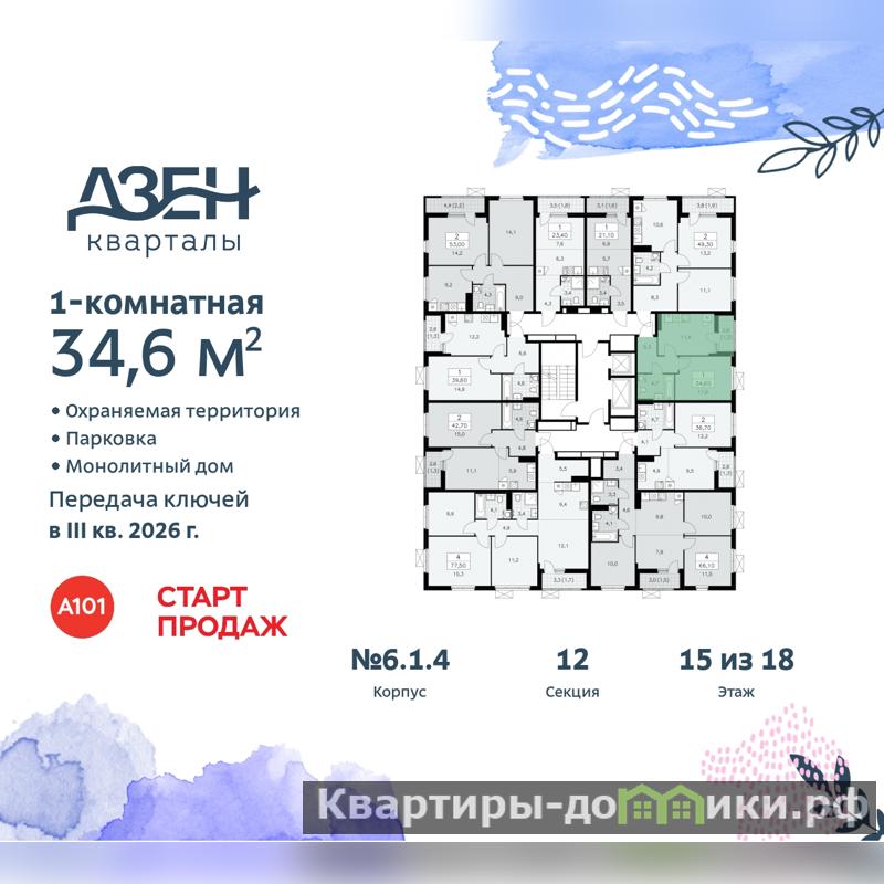 Квартира находится в корпусе 6.1.4. Дом монолитный, одноподъездный, высотой 18 этажей. На этаже 10 квартир. В подъезде 1 пассажирский и 1 грузовой лифт. Начало строительства - 4 квартал 2023 года. Окончание строительства - 3 квартал 2026 года. Оформление сделки по договору долевого участия.
