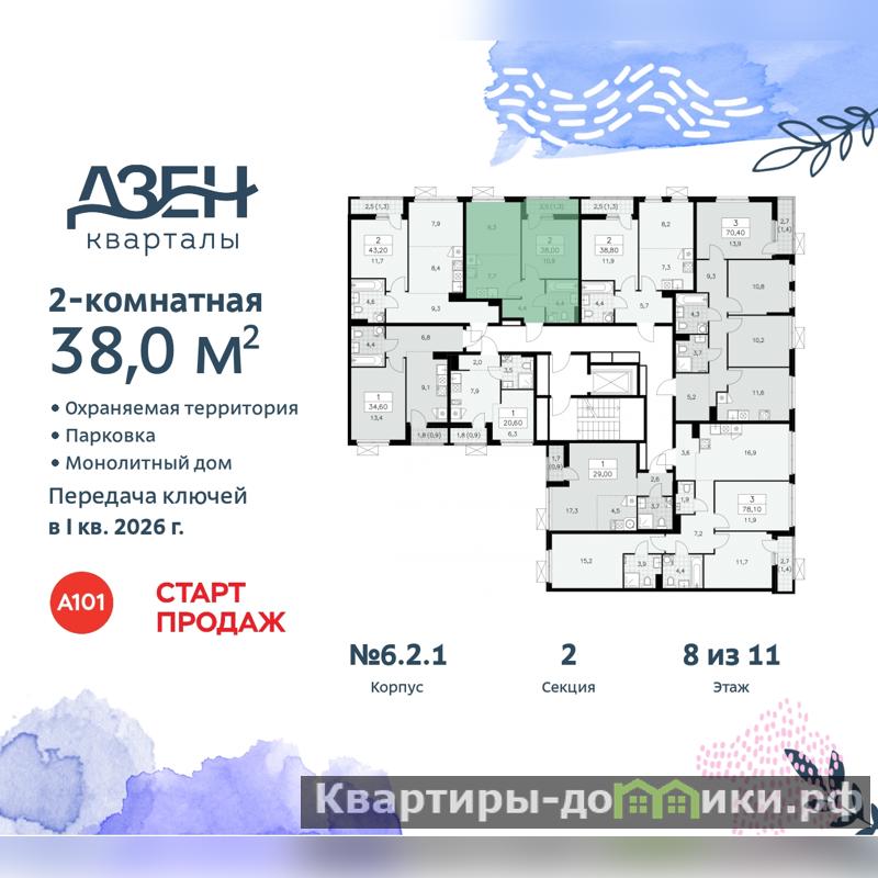 Дом монолитный, многоподъездный, переменной этажности, от 8 до 11 этажей. Квартира находится во 2-й секции высотой 8 этажей в корпусе 6.2.1. На этаже 8 квартир. В подъезде 1 грузовой лифт. Начало строительства - 4 квартал 2023 года. Окончание строительства - 1 квартал 2026 года. Оформление сделки по договору долевого участия.