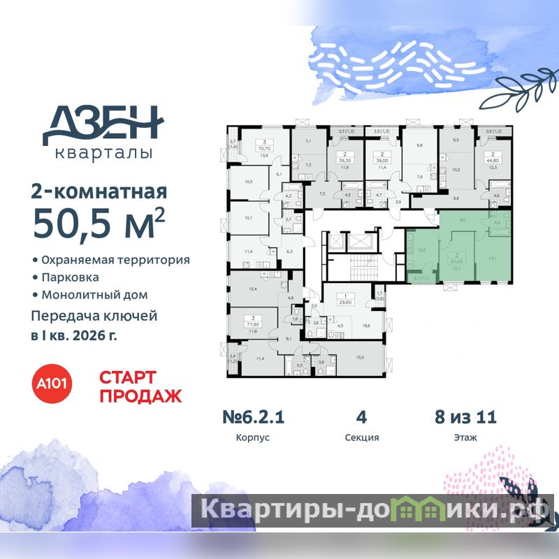 Просторная двухкомнатная квартира в ЖК "Дзен-кварталы" на 8 этаже. Квартира без отделки, новый собственник может сделать ремонт по своему проекту. Общая площадь: 50.5 кв.м., жилая: 25.8 кв.м., площадь просторной кухни-столовой: 10.2 кв.м. Комнаты изолированные, все окна выходят на одну сторону. В квартире одна лоджия, один совмещенный санузел. Высота потолков 2.8 м.