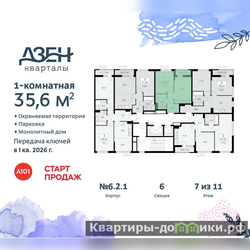 Продается 1-комн. квартира от застройщика в ЖК "Дзен-кварталы" на 7 этаже. Квартира без отделки, новый собственник может сделать ремонт по своему дизайн-проекту. Общая площадь: 35.6 кв.м., жилая: 11.5 кв.м., площадь просторной кухни-столовой: 13.1 кв.м. Все окна выходят на одну сторону. В квартире одна лоджия, один совмещенный санузел. Высота потолков 2.8 м.
