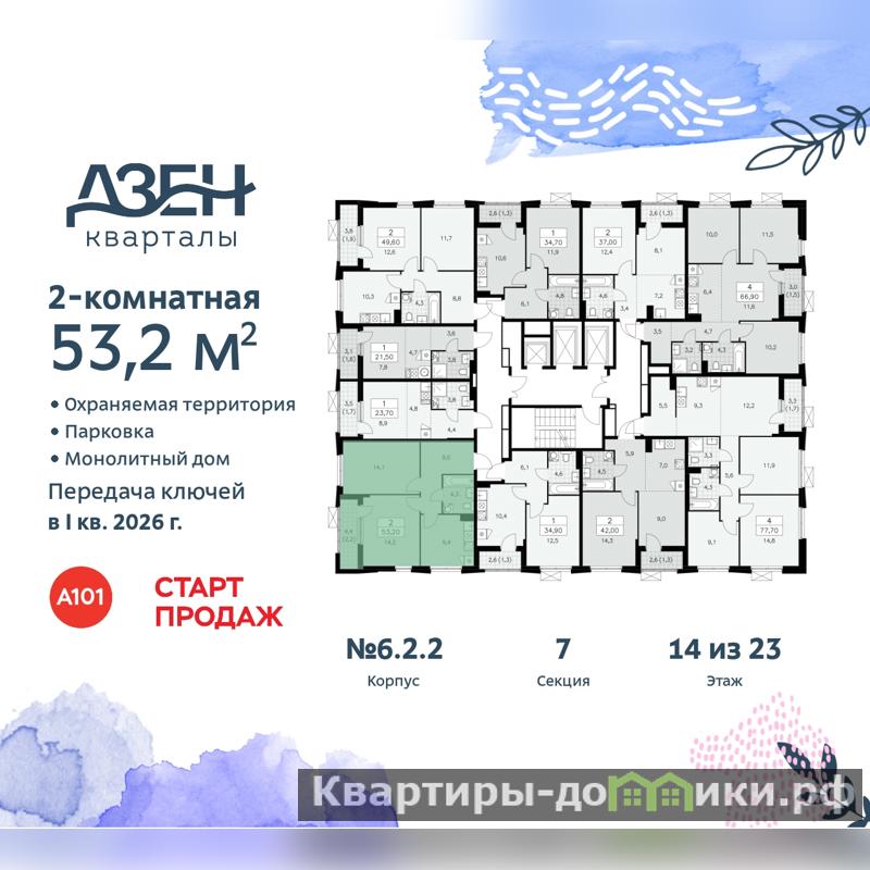 2-комн. квартира в ЖК "Дзен-кварталы" на 14 этаже. Квартира без отделки, после получения ключей можно делать ремонт. Общая площадь: 53.2 кв.м., жилая: 28.3 кв.м., площадь просторной кухни-столовой: 9.4 кв.м. Квартира угловая, очень светлая, естественная вентиляция при открытии окон. В квартире одна лоджия, один совмещенный санузел. Высота потолков 2.8 м.