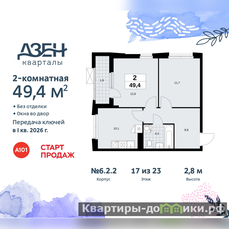 Просторная 2-комн. квартира в ЖК "Дзен-кварталы" на 17 этаже. Квартира без отделки, новый владелец может сделать ремонт по индивидуальному дизайн-проекту. Общая площадь: 49.4 кв.м., жилая: 24.3 кв.м., площадь просторной кухни-столовой: 10.1 кв.м. Угловая квартира, идеально подойдет любителям тишины и панорамных видов. В квартире одна лоджия, один совмещенный санузел. Высота потолков 2.8 м.