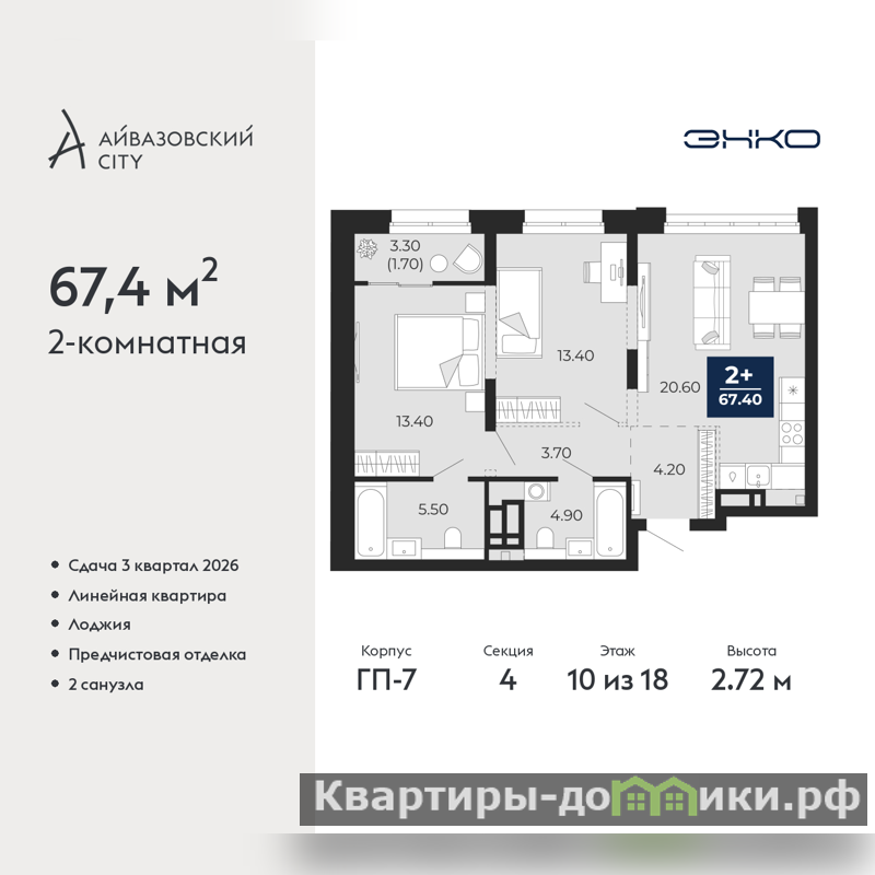 Продается 2-комн. квартира с предчистовой отделкой в ЖК "Айвазовский City" на 10 этаже. Общая площадь: 67.4 кв.м., жилая: 26.8 кв.м., площадь просторной кухни-столовой: 20.6 кв.м. Комнаты изолированные, все окна выходят на одну сторону. В квартире одна лоджия, два совмещенных санузла. Высота потолков 2.72 м.