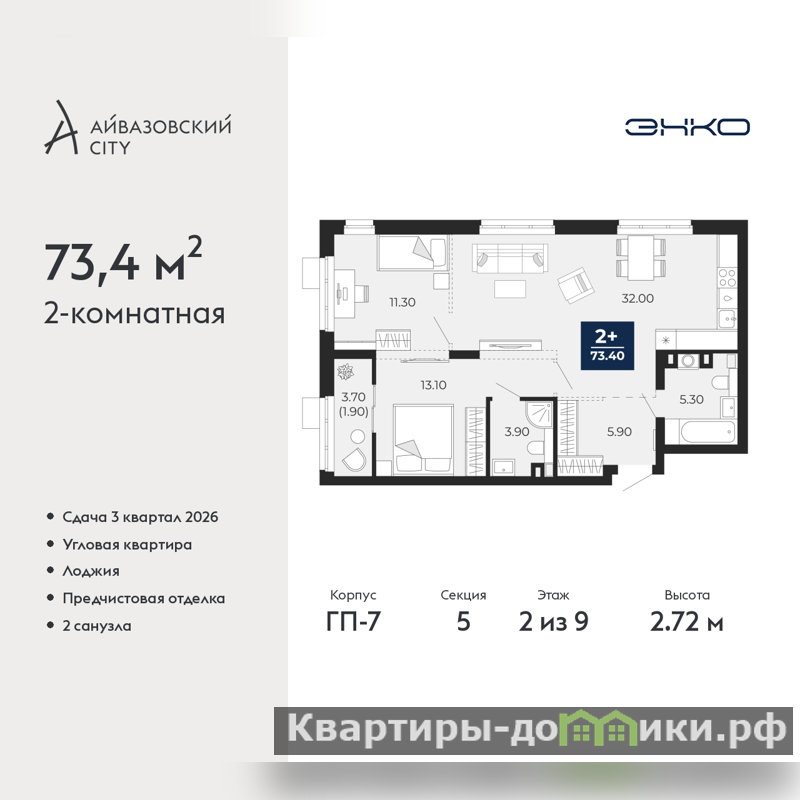 Продается 2-комн. квартира с предчистовой отделкой в ЖК "Айвазовский City" на 2 этаже. Общая площадь: 73.4 кв.м., жилая: 24.4 кв.м., площадь просторной кухни-столовой: 32 кв.м. Квартира угловая, идеально подойдет любителям тишины и панорамных видов. В квартире одна лоджия, два совмещенных санузла. Высота потолков 2.72 м.