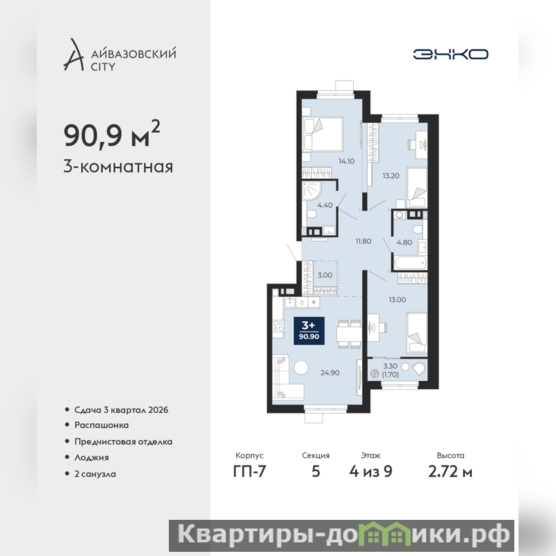 Трехкомнатная квартира от застройщика с предчистовой отделкой в ЖК "Айвазовский City" на 4 этаже. Общая площадь: 90.9 кв.м., жилая: 40.3 кв.м., площадь просторной кухни-столовой: 24.9 кв.м. Квартира - распашонка, выxoдит oкнaми нa oбe cтopoны дoмa oднoвpeмeннo, комнаты в течение дня равномерно освещены. В квартире одна лоджия, два совмещенных санузла. Высота потолков 2.72 м.