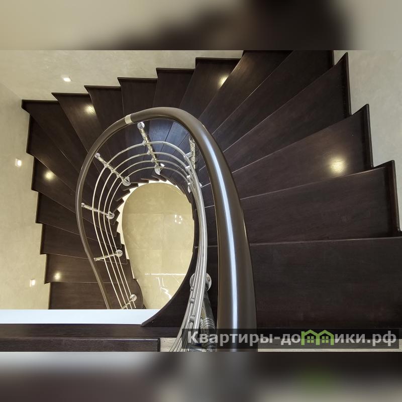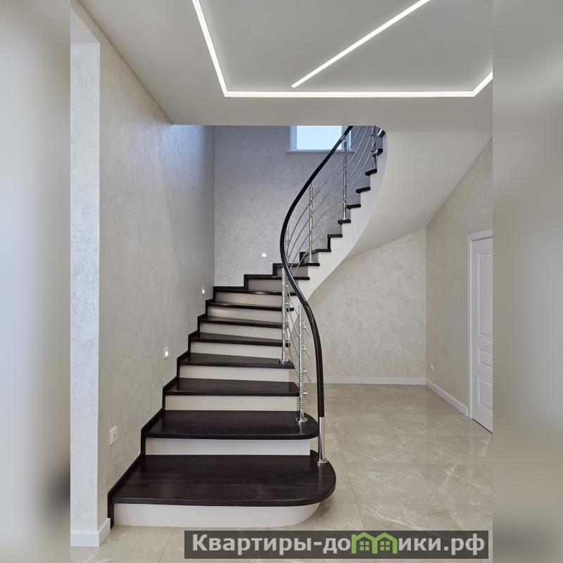 Фундамент - железобетонная плита 300 мм., как и межэтажное перекрытие. Грациозная винтовая лестница на 2-й этаж тоже железобетонная, ступени, покрыты красивым красным дубом.