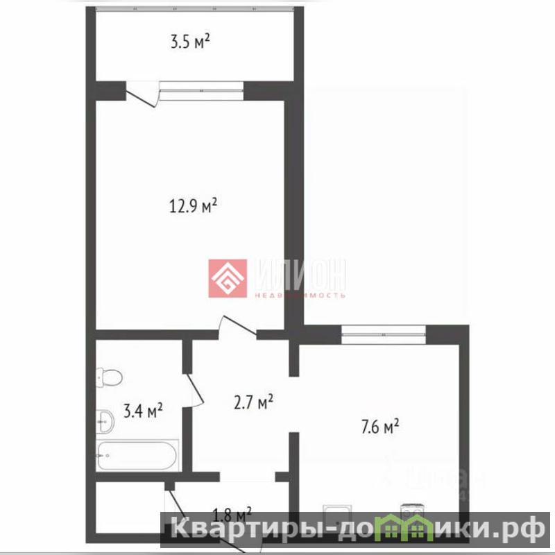 - Общая площадь 28,4 кв. м., жилая 12,9 кв. м, кухня 7,6 кв. м., ванная комната 3,4 кв. м, коридор 1,8/2,7 кв. м., лоджия 3,5 м.