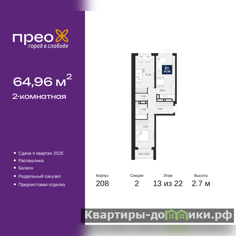 Продается двухкомнатная квартира от застройщика с предчистовой отделкой в ЖК "Прео" на 13 этаже. Общая площадь: 64.96 кв.м., жилая: 28.32 кв.м., площадь просторной кухни-столовой: 18.62 кв.м. Квартира - распашонка, без проходных комнат, окна выходят на paзные стороны дома. В квартире один балкон, один раздельный санузел. Высота потолков 2.7 м.