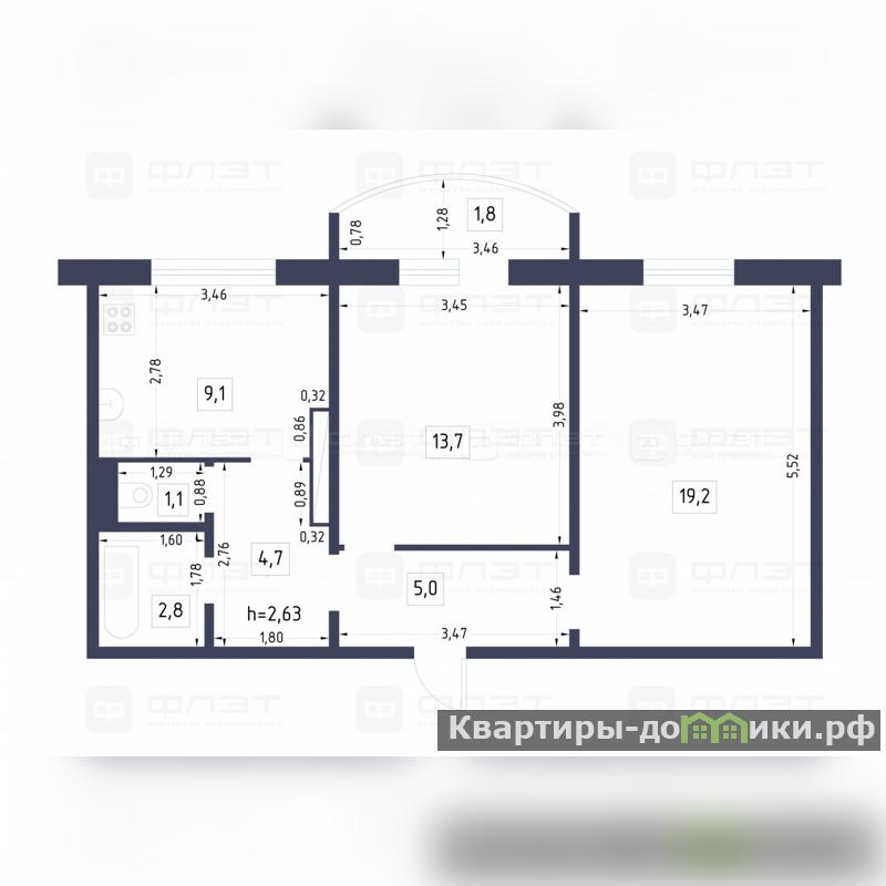 Общая площадь квартиры 58 кв.м, жилая - 33 кв.м (19,1 / 13,9 ), кухня - 9,1 кв.м. Квартира с просторной лоджией.