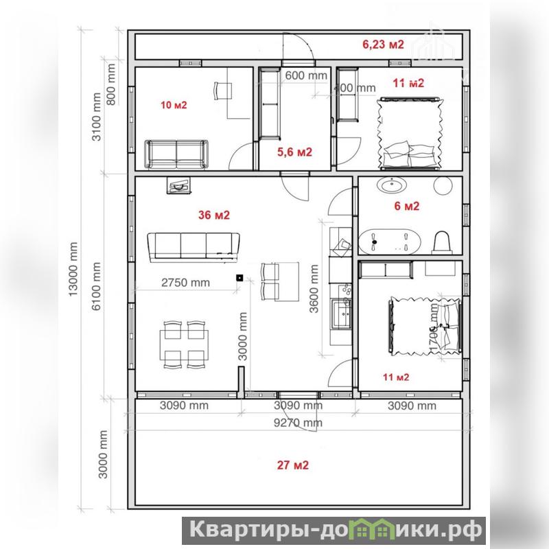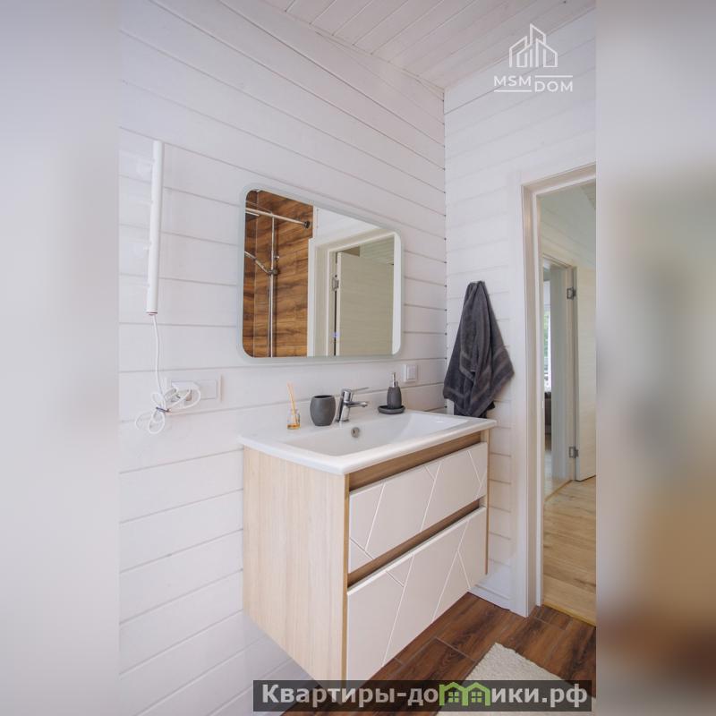 2. Внутренняя отделкаПол – износостойкий влагостойкий ламинат 33 классаСтены – имитация бруса, окрашенная защитным лакомДвери – межкомнатные белого цветаВанная комната – плитка в сочетании с имитацией брусаТеплый пол во всех комнатах