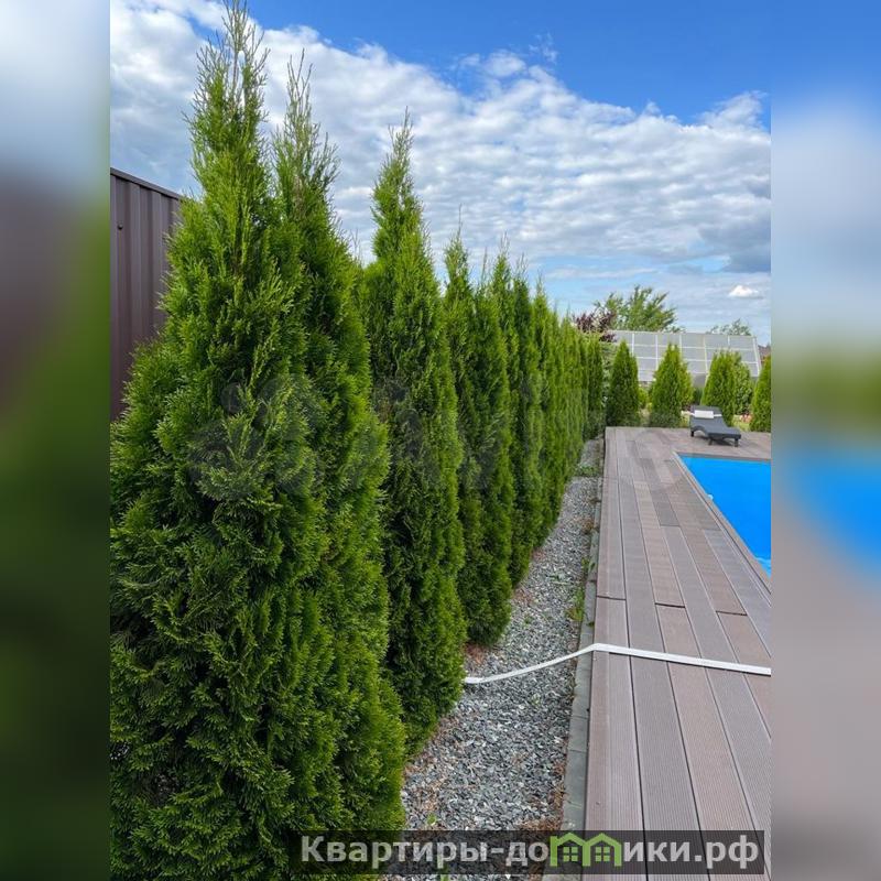 Территория бассейна отделана террасной доской и окружена туями.