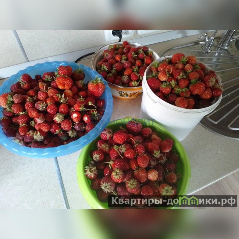 На участке растут смородина, крыжовник, жимолость, клубника, калина.