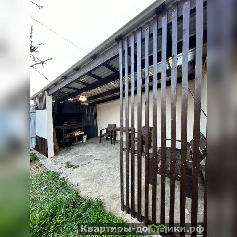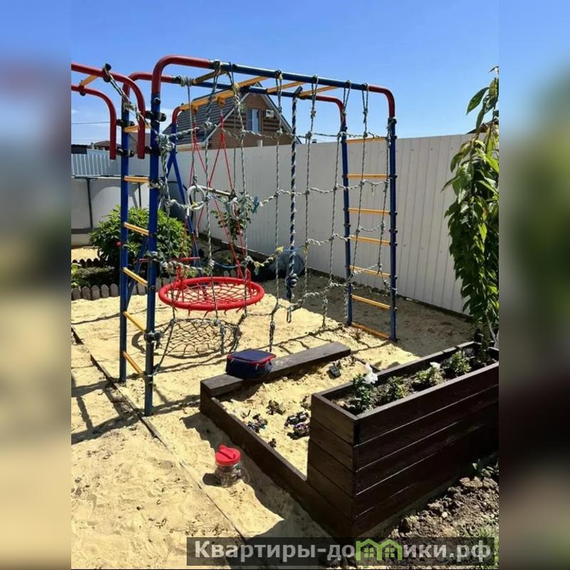Участок ровный, правильной формы и широкий фасад. Здесь оборудована детская игровая зона с песочницей, качелями и турником, на лето устанавливается каркасный бассейн, а также есть мангальная зона. На территории растут плодовые деревья: инжир, слива, груша, гранат, две черешни, яблоня и шесть сортов винограда.