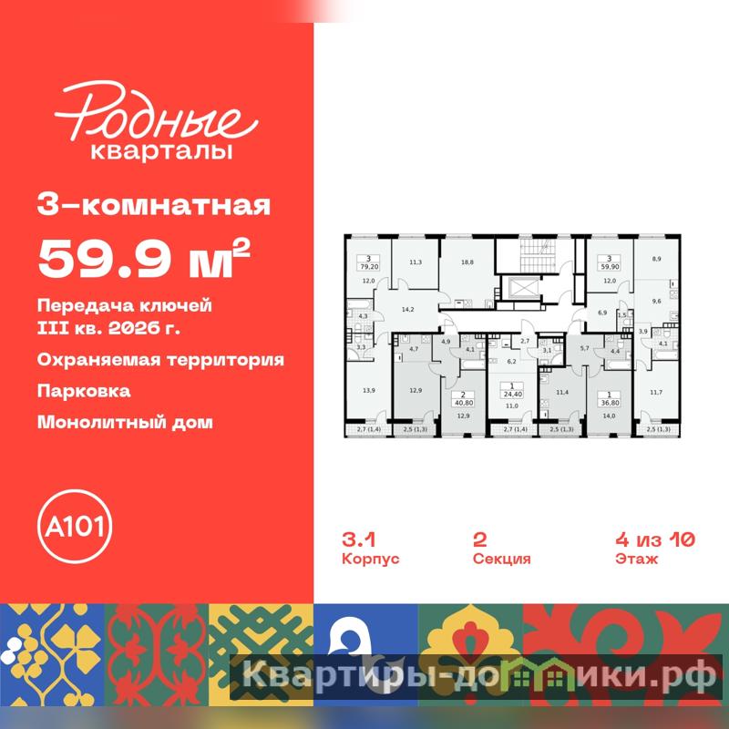 Продается 3-комн. квартира с европланировкой в ЖК "Родные кварталы" на 4 этаже. Квартира без отделки, новый собственник может сделать ремонт по своему проекту. Общая площадь: 59.9 кв.м., жилая: 32.6 кв.м., общая площадь гостиной-столовой с кухонной зоной: 18.5 кв.м. Европейская планировка, за счет большой площади кухни-гостиной квартира выглядит просторной и очень удобна для жизни. Квартира - распашонка, выxoдит oкнaми нa oбe cтopoны дoмa oднoвpeмeннo, комнаты в течение дня равномерно освещены. В квартире один балкон, один совмещенный и один раздельный санузел. Высота потолков 2.95 м.