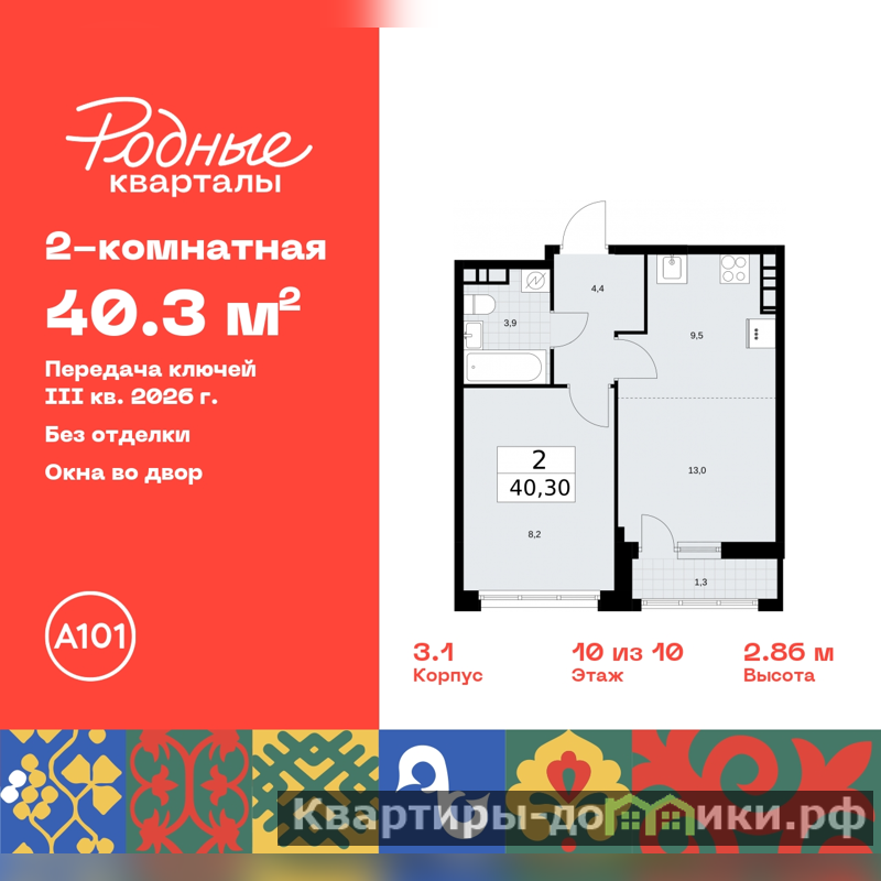 Продается 2-комн. квартира с европланировкой от застройщика в ЖК "Родные кварталы" на 10 этаже. Квартира без отделки, после оформления собственности можно делать ремонт. Общая площадь: 40.3 кв.м., жилая: 21.2 кв.м., суммарная площадь гостиной-столовой с кухонной зоной: 22.5 кв.м. Европланировка, зона гостиной комнаты объединена с кухней. Комнаты изолированные, все окна выходят на одну сторону. В квартире одна лоджия, один совмещенный санузел. Высота потолков 2.95 м.