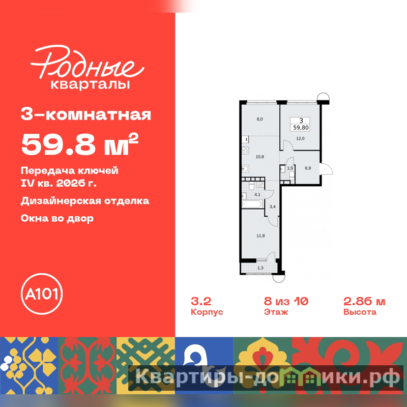 Продается трехкомнатная квартира с европланировкой и отделкой в ЖК "Родные кварталы" на 8 этаже. Общая площадь: 59.8 кв.м., жилая: 31.8 кв.м., суммарная площадь гостиной-столовой с кухонной зоной: 18.8 кв.м. Европейская планировка, кухня-гостиная - идеальный вариант для тех, кто любит часто принимать гостей. Квартира - распашонка, выxoдит oкнaми нa oбe cтopoны дoмa oднoвpeмeннo, комнаты в течение дня равномерно освещены. В квартире один балкон, один совмещенный и один раздельный санузел. Высота потолков 2.95 м.