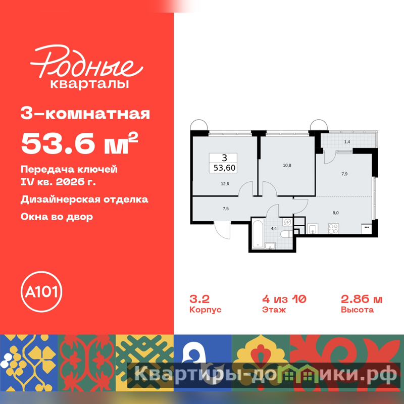 Трехкомнатная квартира с европланировкой и отделкой в ЖК "Родные кварталы" на 4 этаже. Общая площадь: 53.6 кв.м., жилая: 31.3 кв.м., общая площадь гостиной-столовой с кухонной зоной: 16.9 кв.м. Европланировка, кухня-гостиная - идеальный вариант для тех, кто любит часто принимать гостей. Угловая квартира, окна oбecпeчивaют paвнoмepнoe ocвeщeниe в тeчeниe дня. В квартире одна лоджия, один совмещенный санузел. Высота потолков 2.95 м.