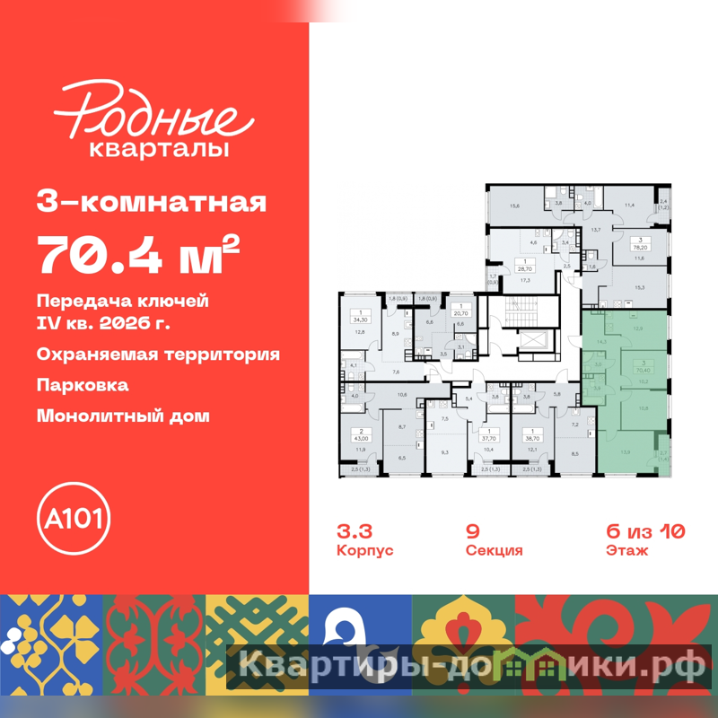 Продается 3-комн. квартира от застройщика с отделкой в ЖК "Родные кварталы" на 6 этаже. Общая площадь: 70.4 кв.м., жилая: 34.9 кв.м., площадь просторной кухни-столовой: 12.9 кв.м. Квартира угловая, идеально подойдет любителям тишины и панорамных видов. В квартире одна лоджия, два совмещенных санузла. Высота потолков 2.95 м.
