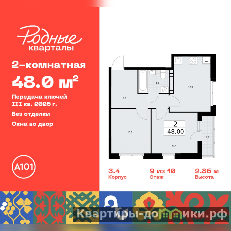 Двухкомнатная квартира от застройщика в ЖК "Родные кварталы" на 9 этаже. Квартира без отделки, полностью готова к чистовой отделке и дальнейшему ремонту. Общая площадь: 48 кв.м., жилая: 21.7 кв.м., площадь просторной кухни-столовой: 12.3 кв.м. Квартира угловая, очень светлая, естественная вентиляция при открытии окон. В квартире одна лоджия, один совмещенный санузел. Высота потолков 2.95 м.