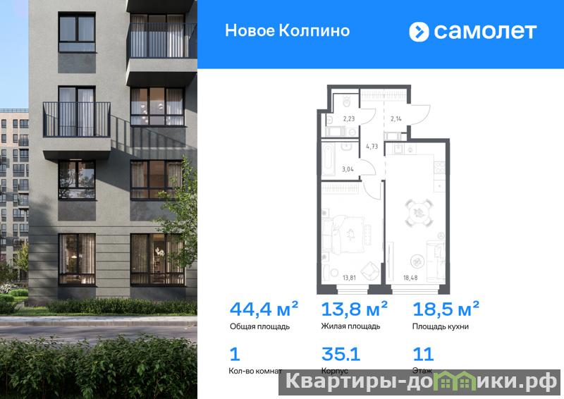 Предлагается 1-комнатная квартира комфорт-класса 44,43 кв.м в корпусе 35.1 на 11 этаже, в ЖК Новое Колпино