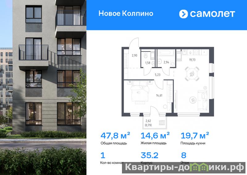 Предлагается 1-комнатная квартира комфорт-класса 47,78 кв.м в корпусе 35.2 на 8 этаже, в ЖК Новое Колпино
