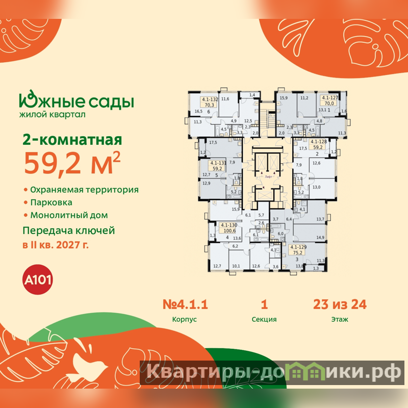 Квартира находится в корпусе 4.1.1. Дом монолитный, одноподъездный, высотой 24 этажа. На этаже 6 квартир. В подъезде 1 пассажирский и 1 грузовой лифт. Начало строительства - 2 квартал 2024 года. Окончание строительства - 2 квартал 2027 года. Оформление сделки по договору долевого участия.