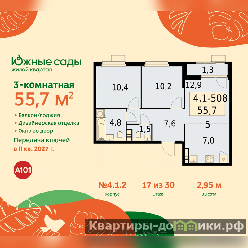 Просторная трехкомнатная квартира с европланировкой и отделкой в ЖК "Южные сады" на 17 этаже. Общая площадь: 55.7 кв.м., жилая: 33.3 кв.м., суммарная площадь гостиной-столовой с кухонной зоной: 19.9 кв.м. Европланировка, зона гостиной комнаты объединена с кухней. Комнаты изолированные, все окна выходят на одну сторону. В квартире одна лоджия, один совмещенный и один раздельный санузел. Высота потолков 2.95 м.